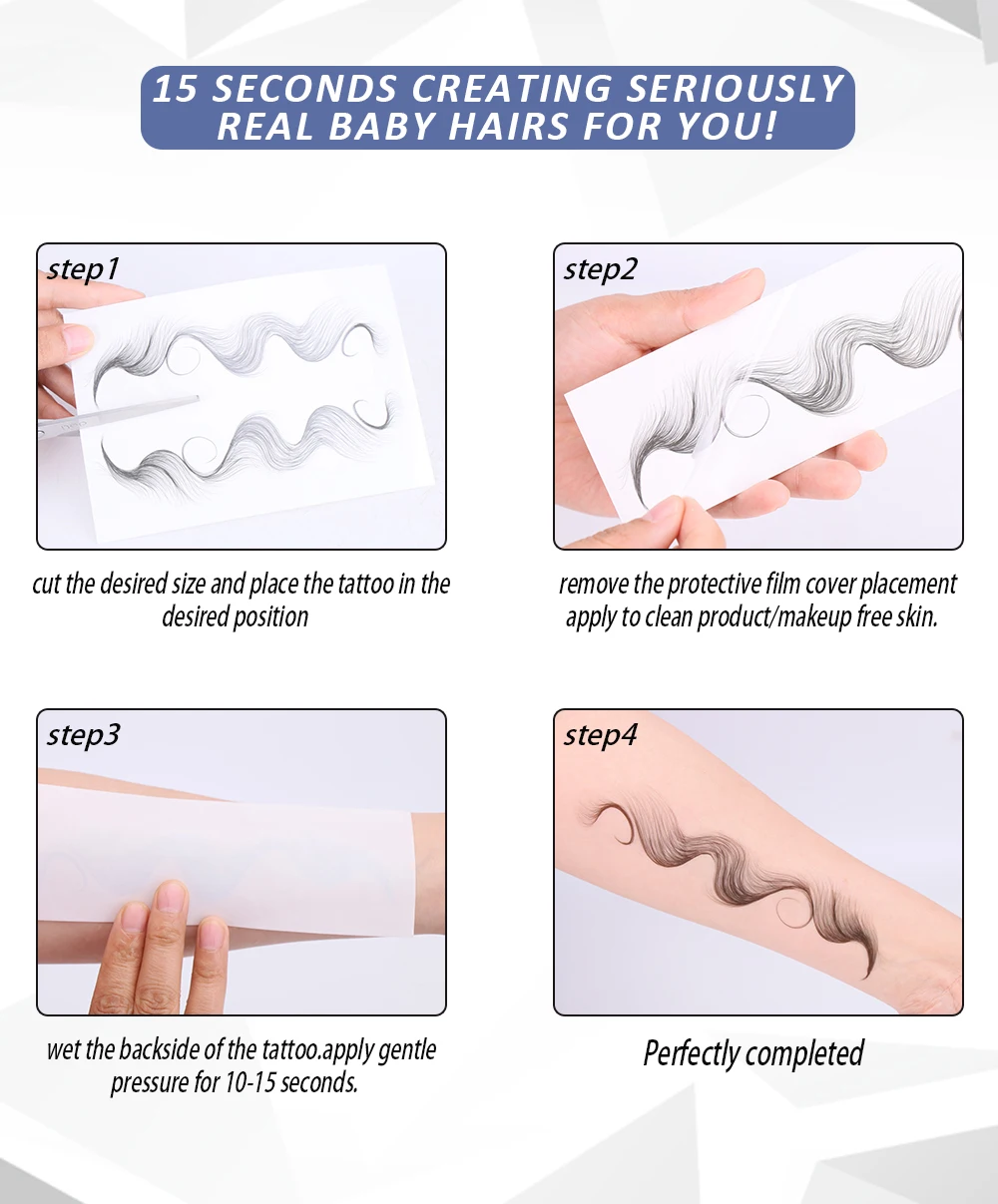 The edges of baby hair style tattoo stickers are 100% waterproof, and keep showers and sweat. Lasts all day without curling or drying out.